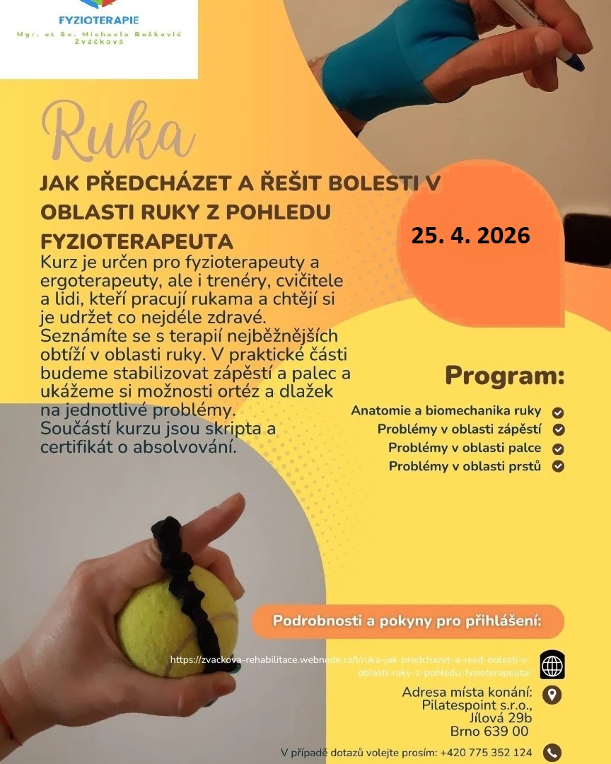 Srdečně Vás zvu na další termín odborného kurzu, který je zaměřen na ruku, její používání, prevenci a řešení bolestí a problémů z hlediska fyzioterapeuta.